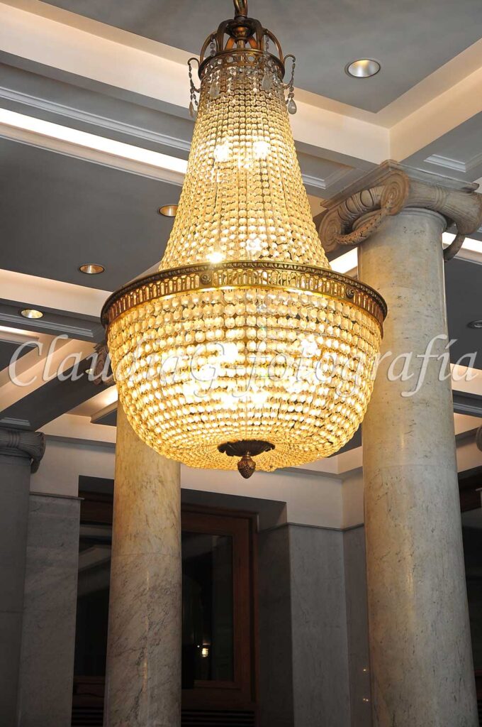 También las 3 arañas de iluminación, traídas en el año 1909 y con las mismas características en cuanto a su origen. Fueron hechas en Inglaterra, realizadas en cristal francés de Baccarat.